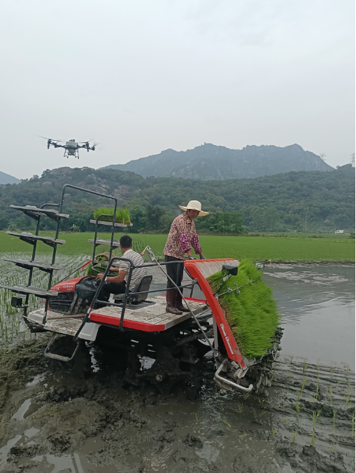 活动现场,工作人员宣传了农机购置补贴政策及水稻机械化育秧扶持措施,帮助参会人员了解政策红利。随后,工作人员进行水稻机械化插秧作业演示。随着农机轰鸣声响起,嫩绿的秧苗从插秧机秧盘滑落,精准、有序地插入稻田,不一会儿,整齐排列的秧苗便为稻田披上“绿装”,不远处,在专业飞手操控下,施肥无人机穿梭于田垄之间,均匀播撒肥料。在演示过程中,农机技术人员还同步进行讲解,详细介绍水稻机插秧、无人机施肥等技术。针对大家在观摩过程中提出的疑问,技术人员现场进行指导,及时解决农机技术问题。据介绍,这次现场会展示的水稻毯状苗是一种适用于机械化插秧的新型育苗方式,其培育的秧苗整体形似厚实规整的毯状,水稻毯状苗根系盘结紧密,苗体分布均匀,秧块标准一致,能与高速插秧机精准适配,显著提升机插效率与质量。相比传统育插秧方式,这项技术培育出的秧苗根系发达、抗逆性强,利于实现水稻高产稳产,是推动水稻生产全程机械化、规模化发展的重要技术支撑。